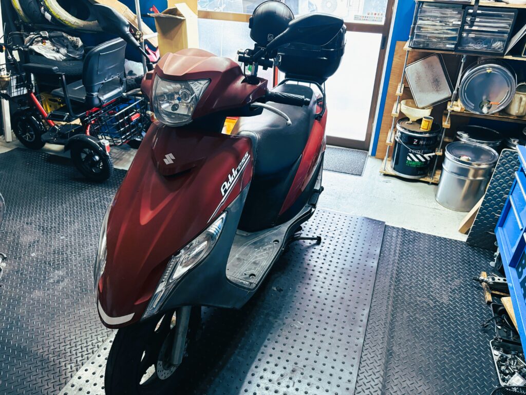 しっかりとレンタルの準備を整え、これから訪問するお客様を待機している凛々しい表情のSUZUKIアドレス125です。