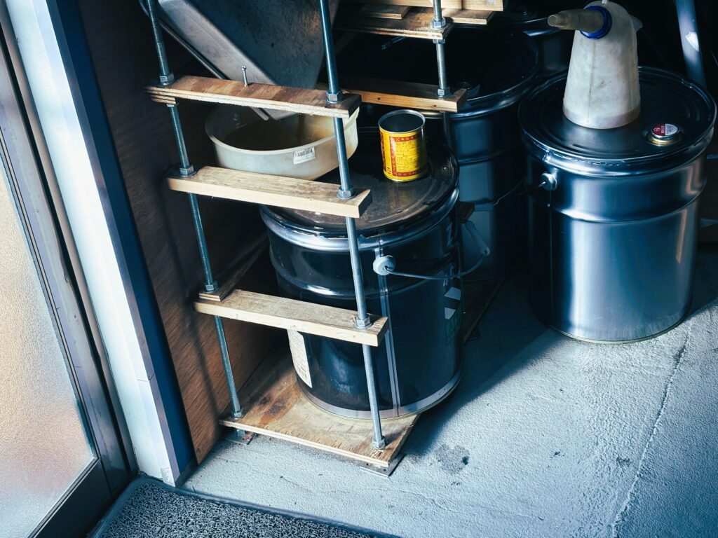 ペール缶のような椅子がポンッと置かれている様子が、ガレージ工房の雰囲気を増していて良いですね!