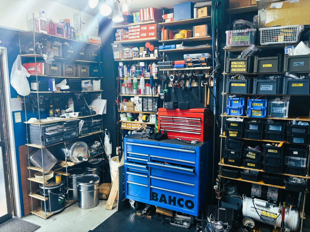 中に入ると壁側にはビッシリと工具や材料などが置かれていて、バイクのガレージ工房感満載です。