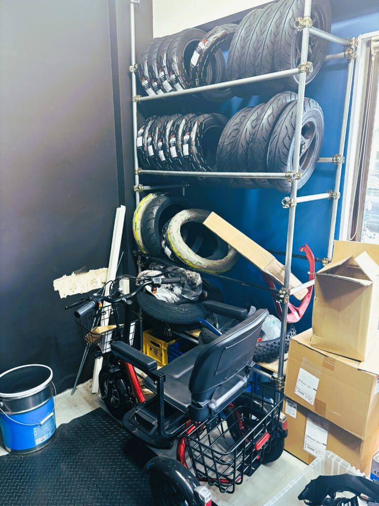 デリバリー業の方へ貸し出すことの多いレンタルバイクでは長距離を走ることがザラなので、いつでも対応できるよう交換用のタイヤもしっかり準備してあります🛞