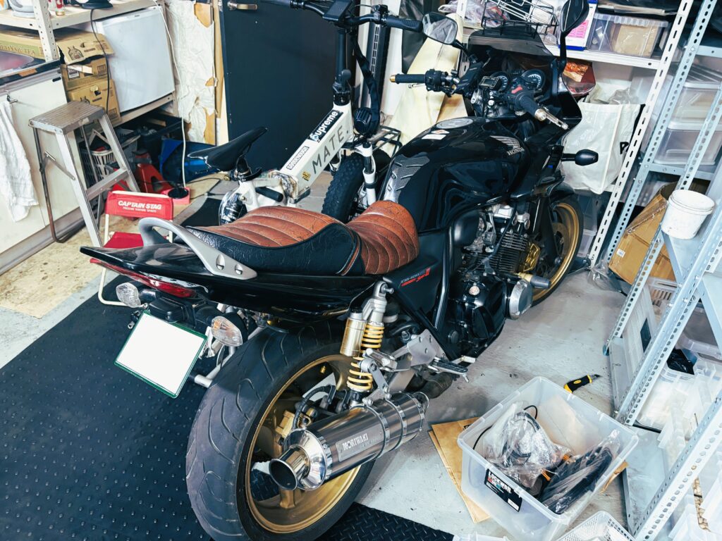 ガレージ奥には渋い外装のHONDA CB400がひっそりと佇んでいました。カッコイイですね…。